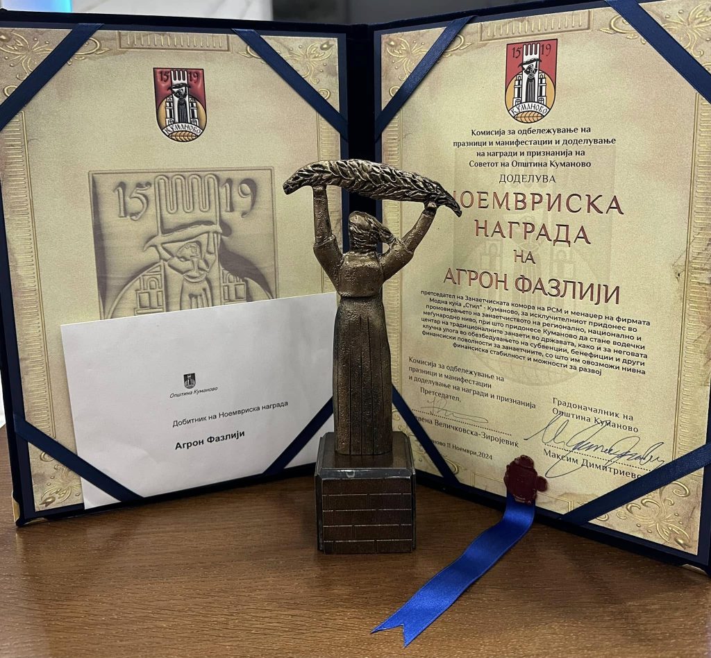 Почитувани соработници, пријатели и сограѓани на Куманово,Денес се чувствувам длабоко почестен и благодарен за оваа важна награда. Сакам да изразам искрена благодарност до сите што ме номинираа и до секој соработник што беше покрај мене во овој пат. Оваа награда не е само моја, туку и на сите оние кои придонесоа и го поддржаа мојот мисија за афирмација и развој на занаетчиството и нашите традиции.Посебна благодарност до Градоначалникот на Општина Куманово и другите институции кои беа дел од ова патување. Без нивната поддршка, многу од овие достигнувања немаше да бидат можни.Оваа награда е мотив да не застанам тука. Со напорна работа и голема посветеност, како и со семејни жртви, посветен сум да продолжам да давам придонес за подобра иднина за градот и за сите националности на Куманово и Северна Македонија. Ова е порака на обединување и соработка за сите нас кои ги делиме истите аспирации за развој и благосостојба.Од срце им благодарам на сите за оваа голема чест!